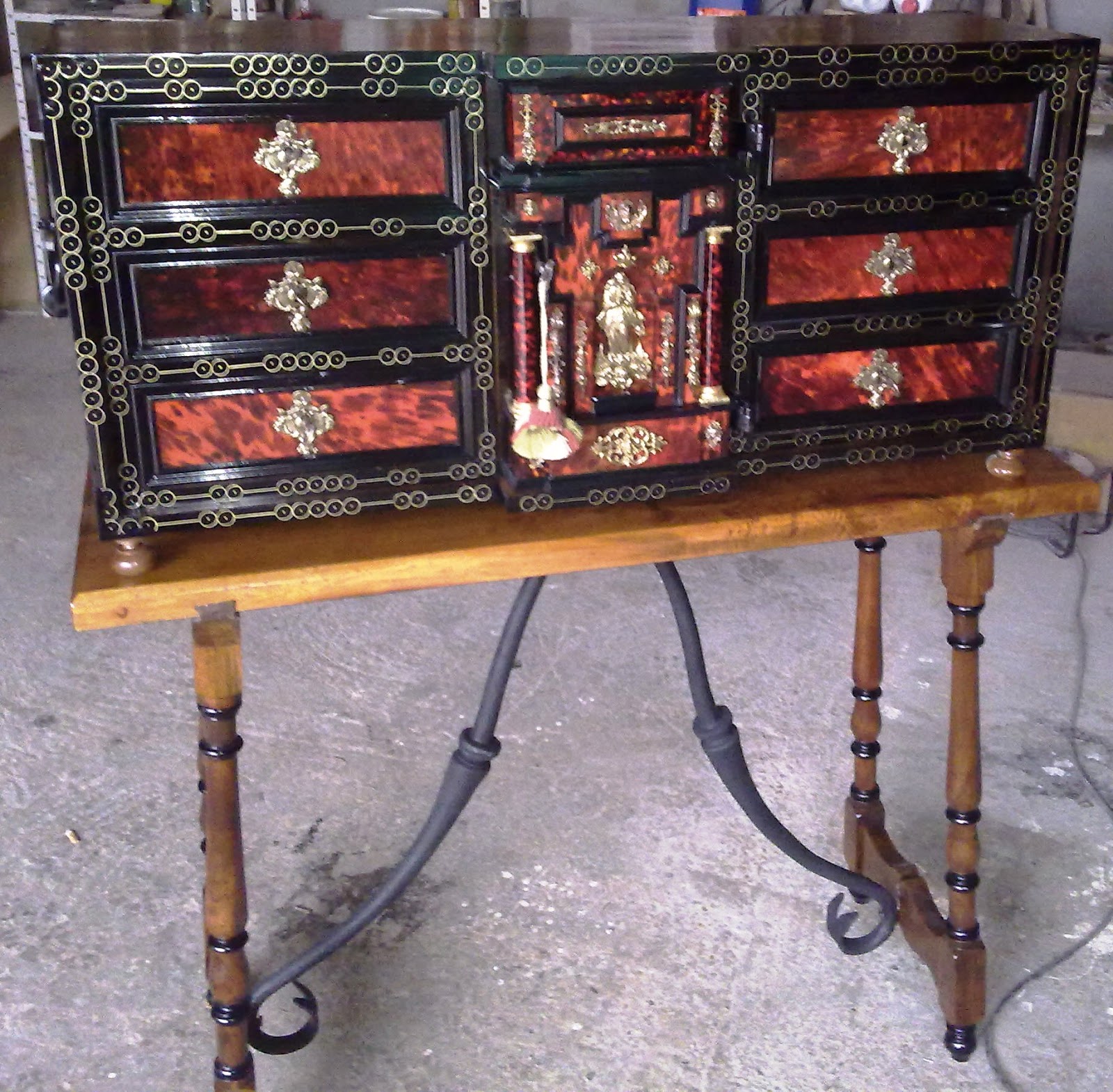Tras un pequeño parón retomamos la actividad en El Taller de la Madera, y esta vez con un mueble de lujo. Hablamos de un bargueño centenario que, tras su paso por el taller, ha recobrado el resplendor que lucía en sus mejores tiempos. Se trata de un mueble muy rico en sus acabados, ya que tiene marquetería, latón embutido, aplicaciones y bocallaves de bronce y, algo que le aporta una gran personalidad, incrustaciones de carey. Aparentemente no se encuentra en muy mal estado, solo falto de un poco de lustre, pero al empezar a desmontar cada pieza, vemos que es necesario renovar la trasera, reponer el carey de ciertas zonas, y dotarle de un acabado que lo proteja y realce su color. La mesa también ha necesitado un lavado de cara, tras el cual, el conjunto es de lo más llamativo.